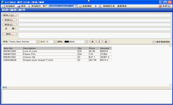1. 支持多账号管理,发送的时候可以再邮件发送界面上部选择对应帐号,支持在邮件界面直接做报价单,具体如上图。邮件界面中点击"新增报价单"系统直接跳出对应的报价单界面,最后再保存并关闭,系统自动把相关内容填充在邮件文本中; |
